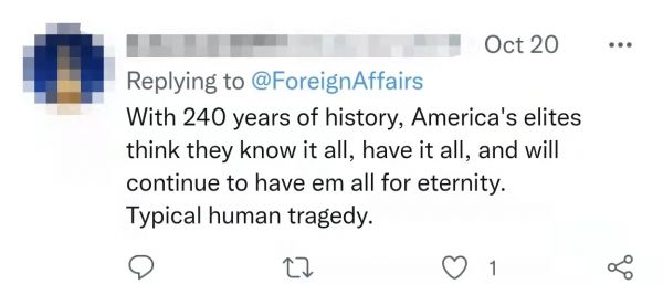 “仅有240年历史的美国精英们认为他们知道一切、拥有一切,并将永远拥有一切。典型的人间悲剧。”