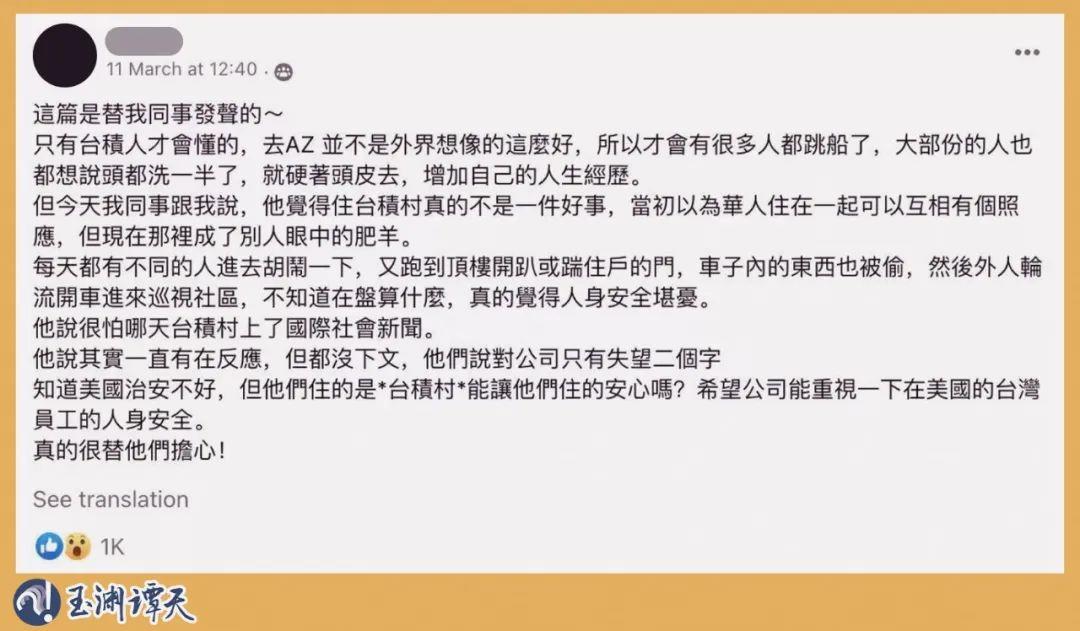 △台湾地区网民评论 台积电作为垄断性的高技术产业被“卖”掉,相当于是要“搬空”台湾地区的人财物,“榨干”台湾地区。 去年年末,台积电在美国亚利桑那州的新厂举行移机典礼,首批设备从台湾地区运至新厂,紧随其后,就是逾千名台积电工程师陆续前往美国。从厂到人,台积电开始向美国输送本钱,这些行动,台积电创办人张忠谋直言,是在美国政府的“敦促”下做出的。 谢大宁告诉谭主,搬去美国,是完完全全的政治决定,是对台积电和蔡英文当局两头施压的结果。当时,这个决定是在美国没有任何补助保障的情况下做出的,并且台积电原本只打算投资120亿美元,在美国总统出席移机典礼后,台积电立即就宣布投资提升到400亿。 这样的投资,百害无一益。谢大宁给了谭主一个数:台积电搬去美国后,高阶制程的收益会骤减40%左右。 台积电原本就是靠高阶制程的盈利来养中低阶制程,这样一来,相当于整体财务都会出现问题。 并且,不仅是台积电本身,那些去到美国的台积电人,过得也并不舒服。 脸书有一个内部小组,“TSMC(台积电的缩写)大小事”。里面提到台积电美国厂的帖子,情绪一般都很负面: