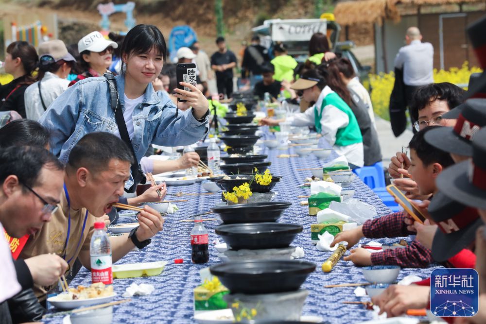 4月1日,游客在油菜花地里品尝乡间长桌宴。新华社记者 徐昱 摄