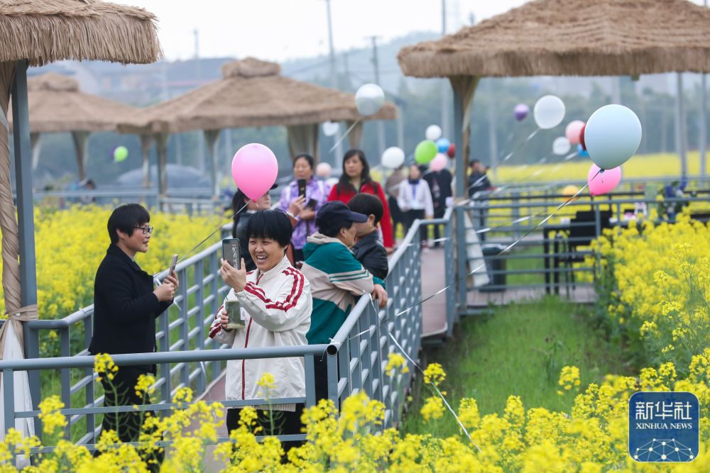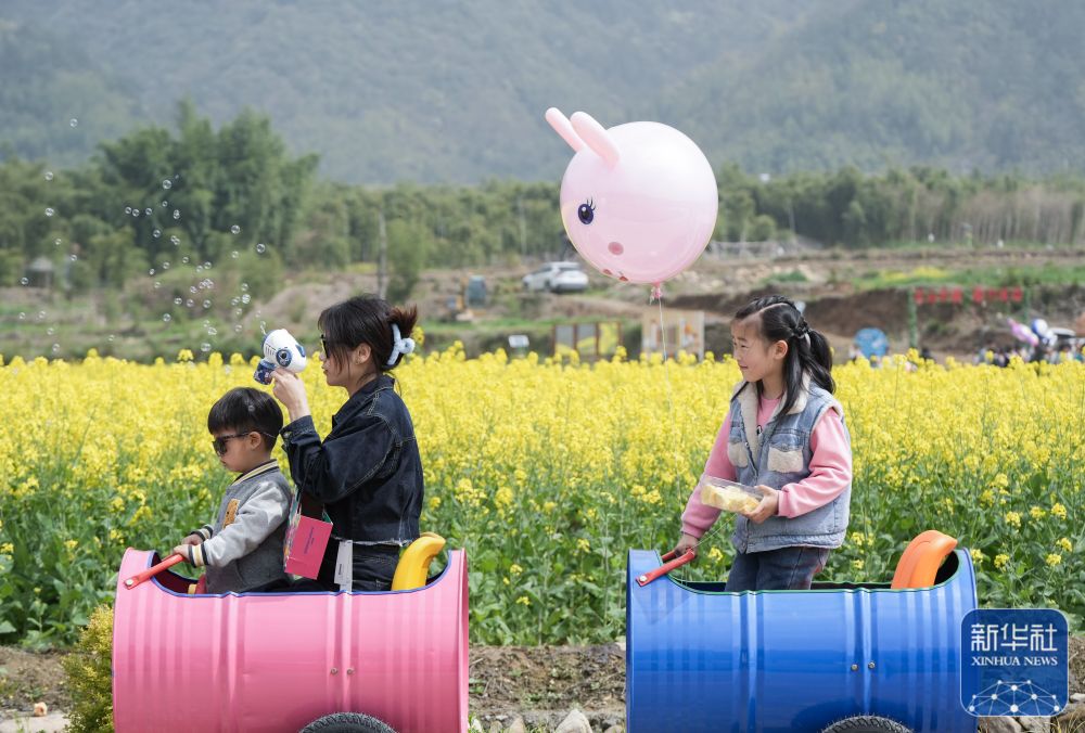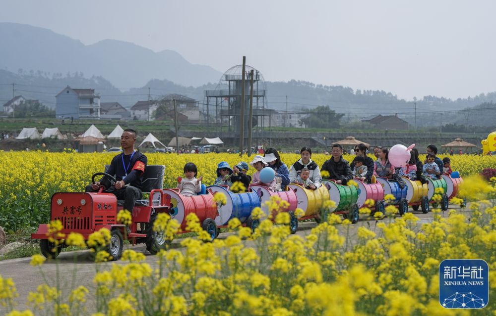 4月1日,游客乘坐田野小火车在油菜花地里感受春日美景。新华社记者 徐昱 摄 当日,2023中国临安郎家共富稻田油菜花节在浙江省杭州市临安区青山湖街道郎家村“共富稻田”开幕,吸引各地游客前来感受春季田野的韵味。 近年来,浙江省杭州市临安区青山湖街道郎家村以党建引领探索“共富稻田”农文旅融合发展模式,成立“强村公司”,以“村落景区”的模式运营。“共富稻田”定位集现代农业、休闲旅游观光为一体的多功能田园农旅综合体,在稻田里养鱼、牛蛙和小龙虾等,陆续打造了妙哉花园、霍比特小屋、稻田观光道、稻田餐厅、稻田茶吧、厨娘美食等乡村旅游特色节点,让城里人来村里体验户外农田生活,助力乡村旅游和百姓共富。