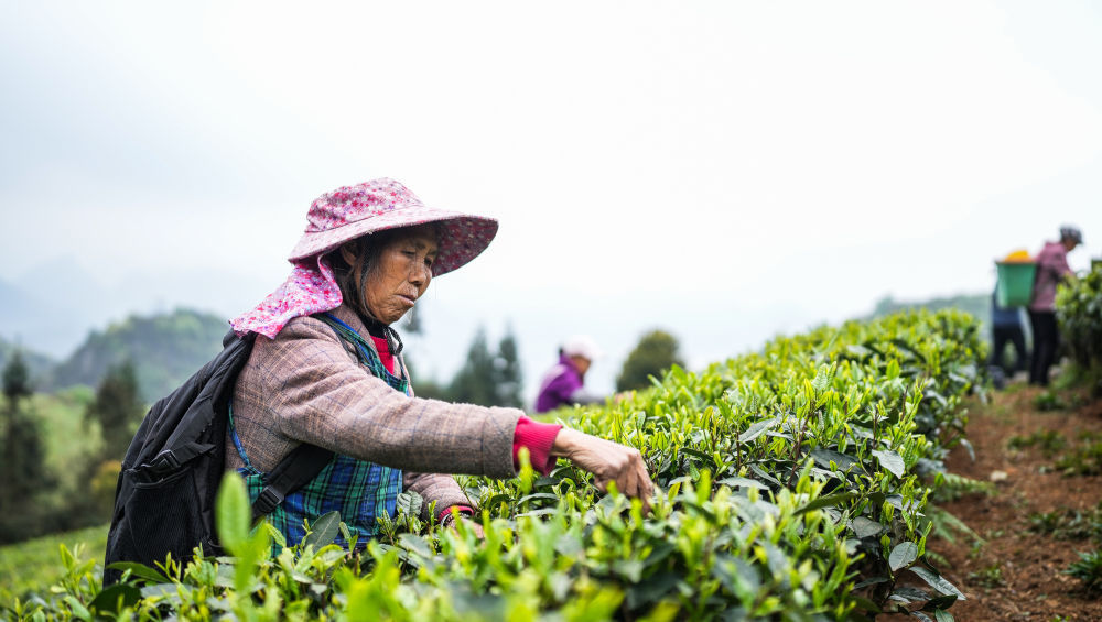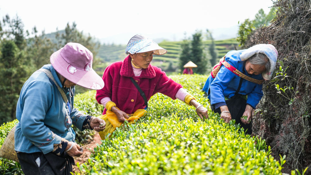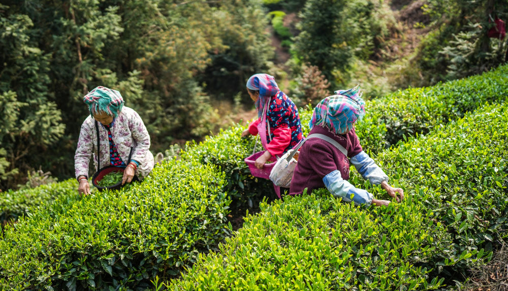 ↑茶农在六盘水市六枝特区月亮河彝族布依族苗族乡花德村茶园采摘春茶(3月31日摄)。