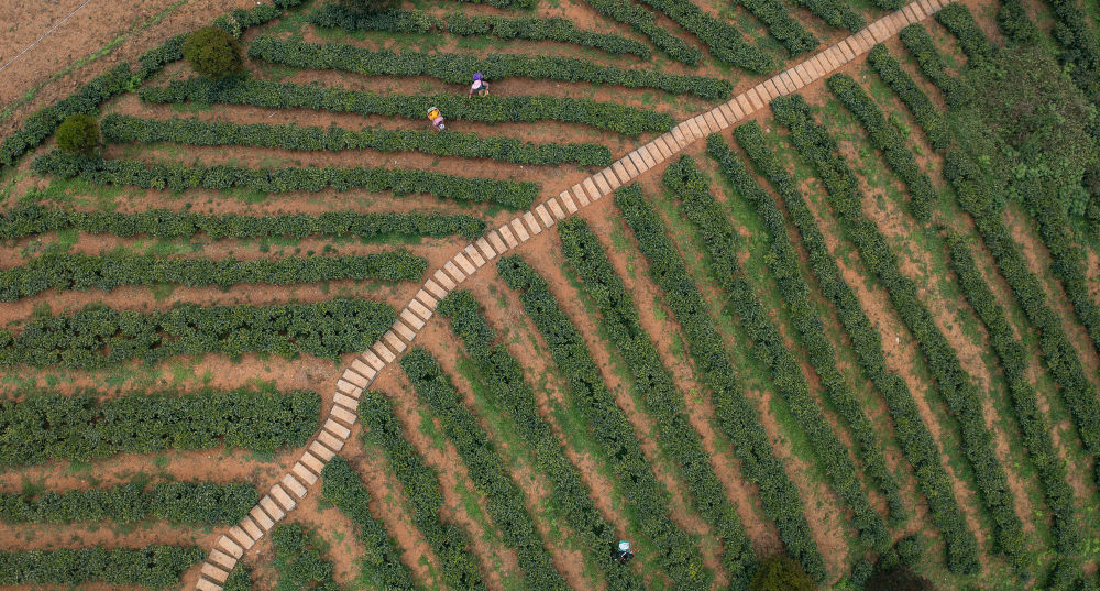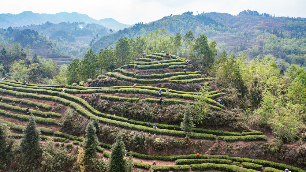 ↑茶农在六盘水市六枝特区月亮河彝族布依族苗族乡花德村茶园采摘春茶(3月31日摄,无人机照片)。