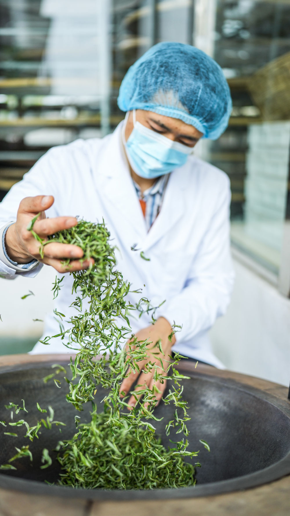 ↑六枝特区落别布依族彝族乡一茶叶加工企业工人在进行手工茶炒制(3月31日摄)。