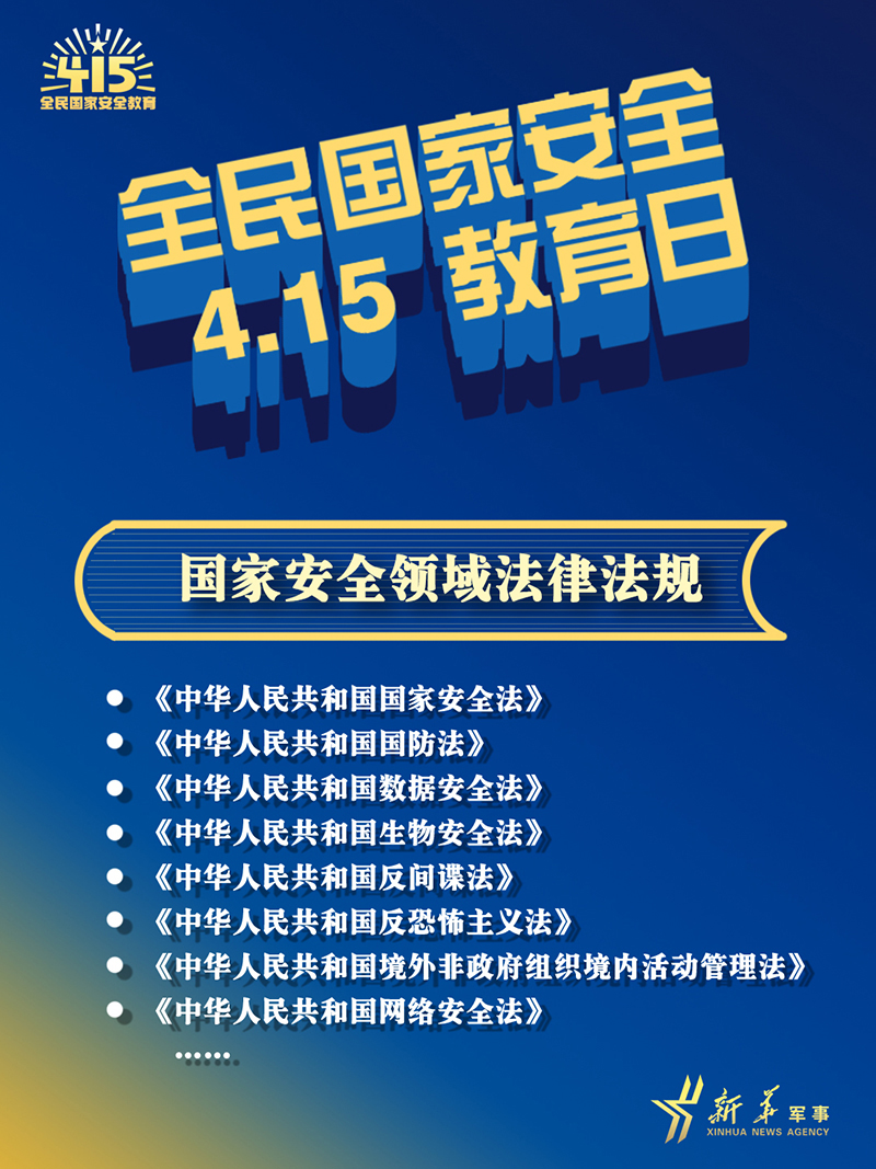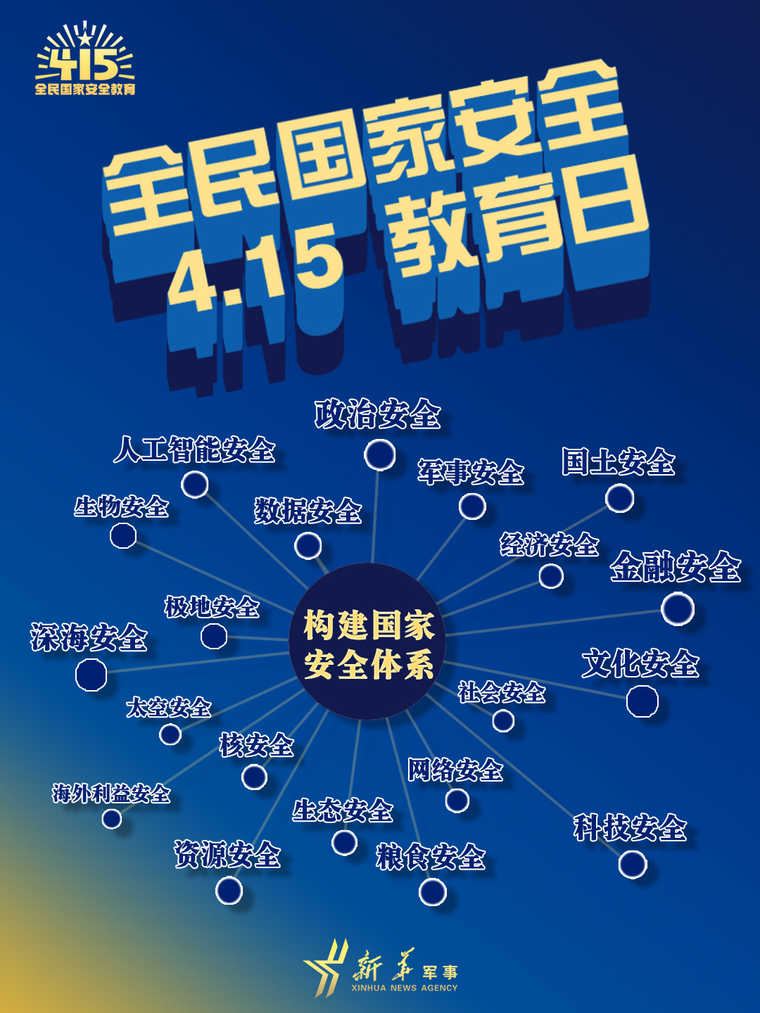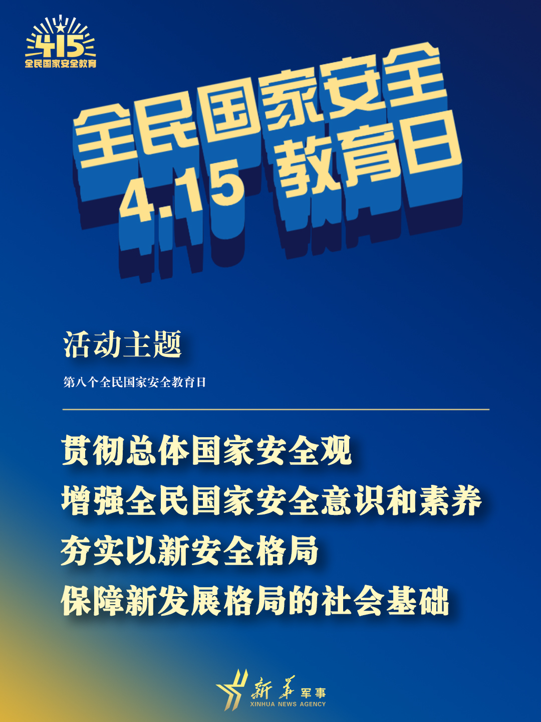 2023-04-15 10:59:14 来源:新华社解放军分社 责任编辑:周冬 作者:今年4月15日是第八个全民国家安全教育日。今年全民国家安全教育日的活动主题为“贯彻总体国家安全观,增强全民国家安全意识和素养,夯实以新安全格局保障新发展格局的社会基础”。 国家安全在身边,春风化雨润心田。为了有效推动大安全理念深入人心、落地生根,新华社解放军分社值此推出系列创意海报,以更生动多彩的表现形式,帮助大家学习国家安全知识、提高全民国家安全意识和素养。