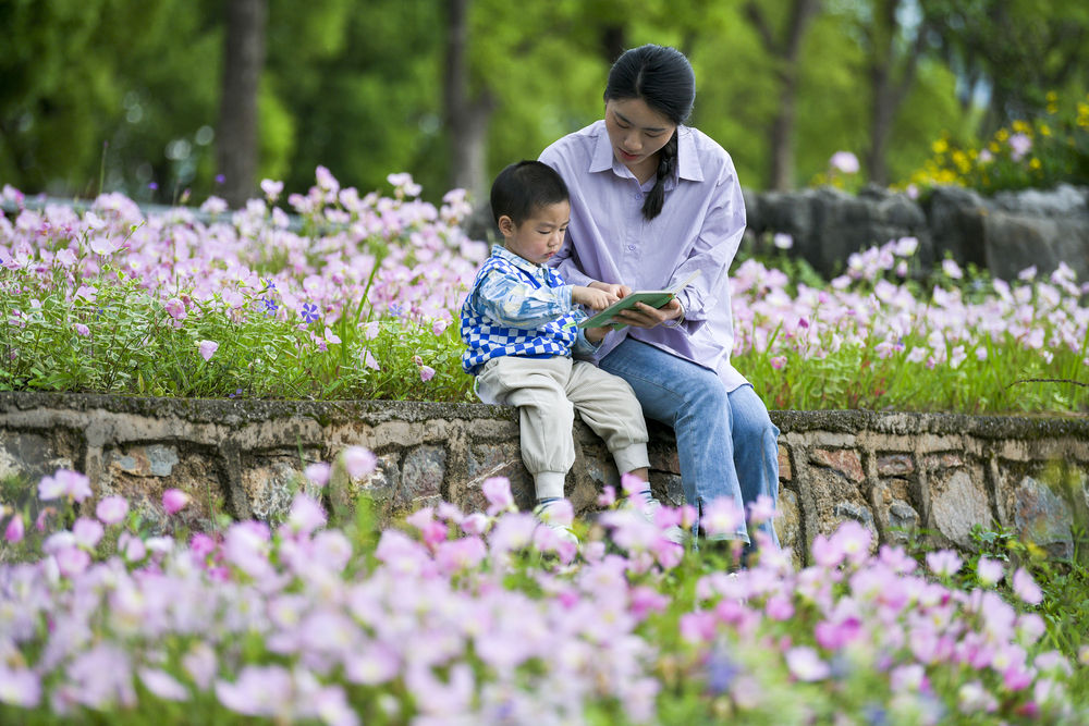 4月22日,家长带着孩子在贵州省遵义市余庆县一公园内读书。新华社发(周磊 摄)