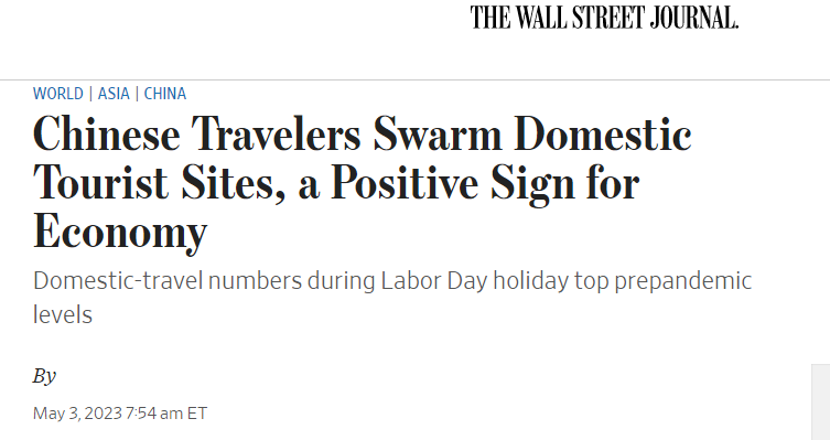 美国《华尔街日报》报道称,在一年一度的“五一”假期期间,大量中国游客出行,在这个幅员辽阔的国家,各地旅游景点人山人海,这是一个令人鼓舞的迹象,说明中国在消费带动下的经济复苏依然强劲。