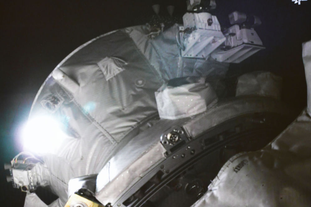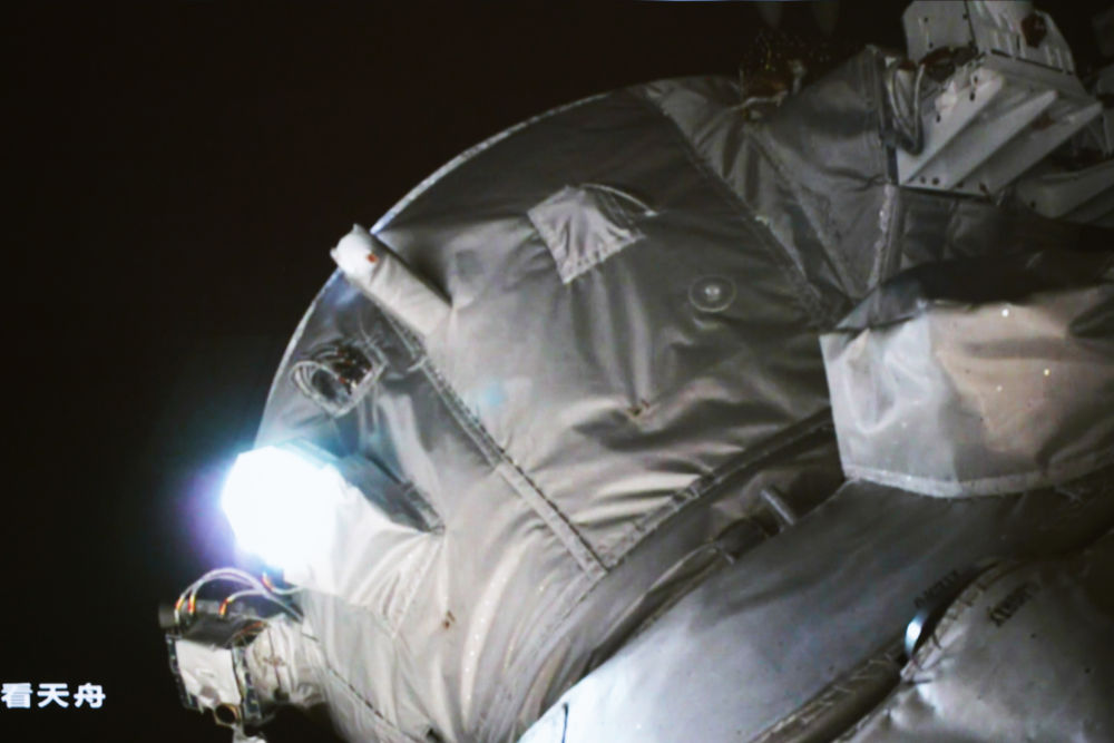 ↑5月11日在北京航天飞行控制中心拍摄的天舟六号货运飞船向空间站组合体靠拢的画面。新华社记者 郭中正 摄