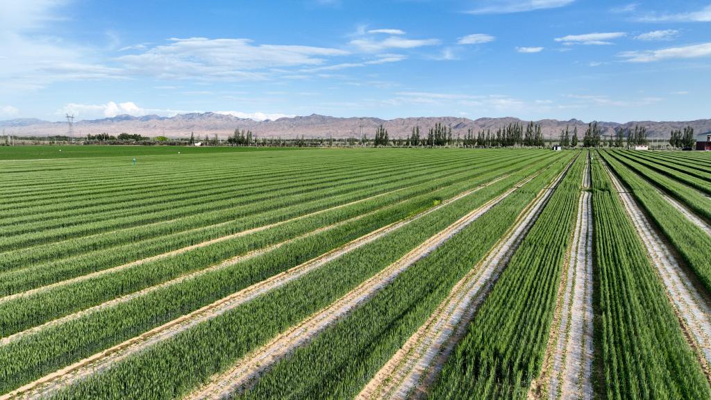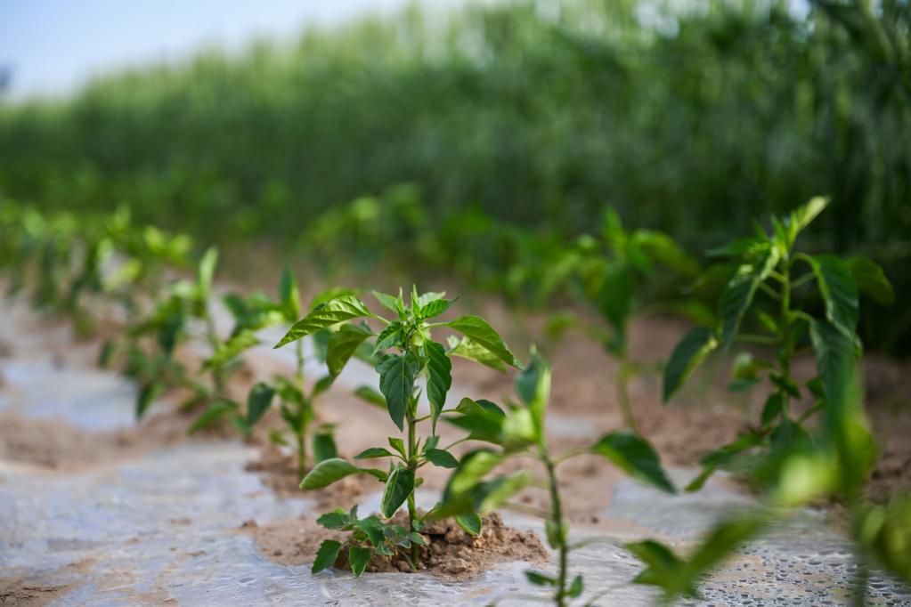 这是6月5日拍摄的位于乌梁素海南岸的现代农业示范园区内小麦、辣椒带状种植田。新华社记者 连振 摄