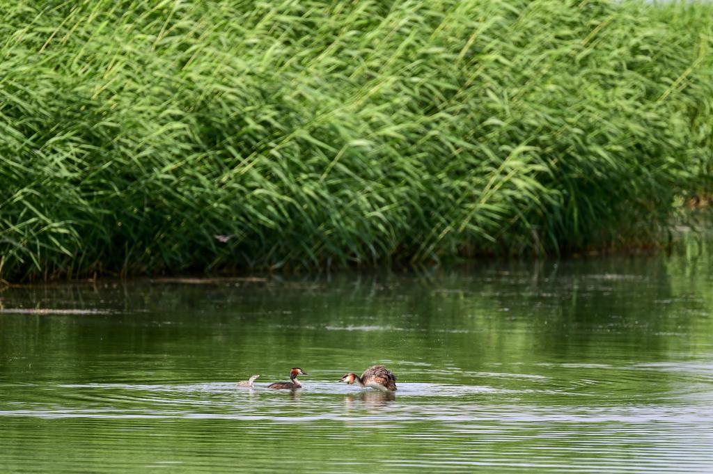 6月5日,水鸟在乌梁素海水面上嬉戏。新华社记者 连振 摄
