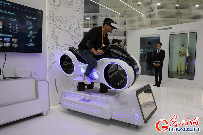 中国电信旗下的VR摩托基于5G网络打造的VR虚拟摩托体验游戏,戴上虚拟头戴设备,可以体验骑行场景。在搭载5G网络之后,刷新速度更快,画面更清晰流畅。2023年11月7日,“互联网之光”博览会上游客在体验VR摩托。(光明网记者崔益明/摄)