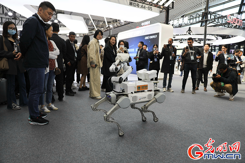 国家电网浙江电力的“新员工”——电力巡检机器狗,参与了本次2023年世界互联网大会乌镇峰会的保电工作中。依靠3D导航激光雷达、避障传感器、热成像双光谱云台等技术,实现电力巡检。图为2023年11月7日,“互联网之光”博览会上电力巡检机器狗吸引观众的关注。(光明网记者崔益明/摄)