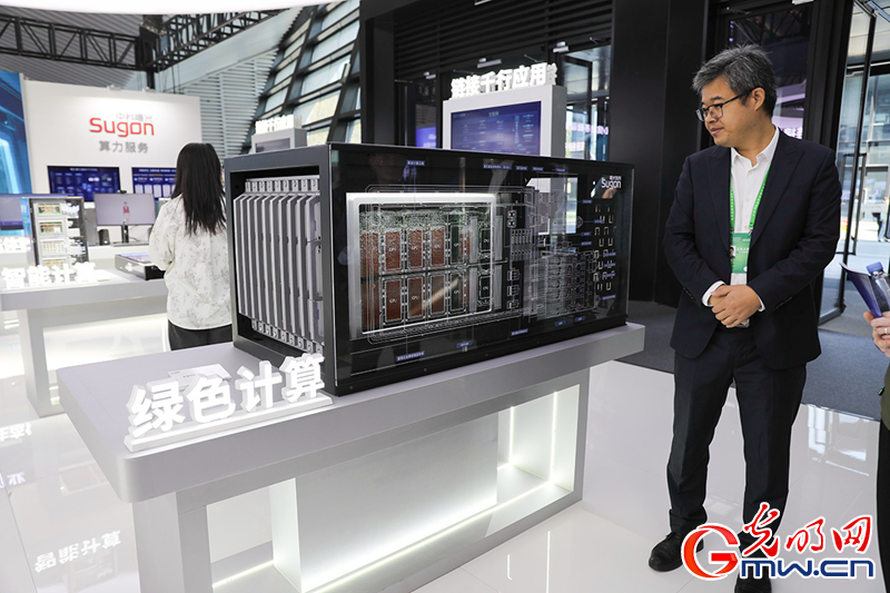 随着AI加速高算力时代的到来,绿色算力成为核心竞争力。图为2023年11月7日,“互联网之光”博览会上中兴展台展示了面向未来数据中心的整体解决方案及创新成果。(光明网记者崔益明/摄)