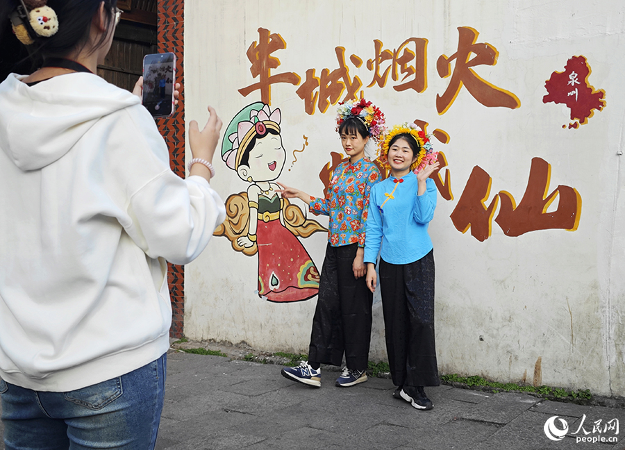 游客们在泉州古城西街拍照留念。人民网 黄东仪摄