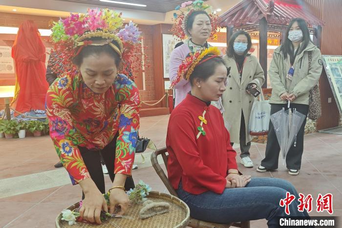 1月29日,蟳埔女在向游客们展示“簪花围”的过程。 吴冠标 摄