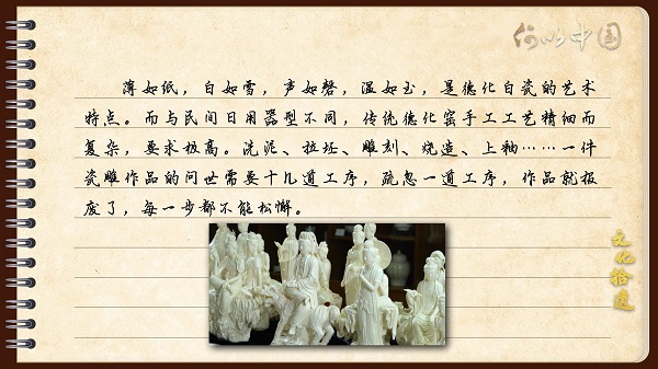 薄如纸,白如雪,声如磬,温如玉,是德化白瓷的艺术特点。而与民间日用器型不同,传统德化窑手工工艺精细而复杂,要求极高。洗泥、拉坯、雕刻、烧造、上釉……一件瓷雕作品的问世需要十几道工序,疏忽一道工序,作品就报废了,每一步都不能松懈。