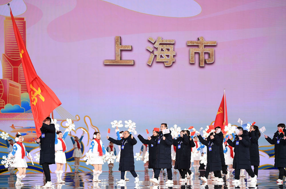 2月17日,上海市体育代表团在开幕式上入场。新华社记者 邓华 摄 亮丽北疆 团结赞歌 童声嘹亮,微光汇聚,舞台的背景从星河灿烂到旭日东升,以“燃情冰雪 筑梦北疆”为主题的文体展演在歌声中拉开序幕。 顶碗姑娘翩翩起舞,搏克手激情昂扬,舞台变为歌与舞的海洋。北疆的歌悠长、北疆的曲嘹亮,歌中唱出各族儿女携手奋进的壮丽图景,热情欢迎不以山海为远、共赴团结之约的新友故交。 长调响起,舞台中央身着红衣的舞蹈演员时而抬头、时而踢腿,犹如驰骋的蒙古马,迎风而立,踏冰卧雪。马头琴声铿锵,枣红色的“蒙古马”与银白色的“马群”汇合,共同奔向无垠的远方。 “十四冬”开闭幕式总导演沙晓岚表示,蒙古马精神是代表内蒙古人民精神品格的文化符号,用马舞和马头琴表演将蒙古马精神具象表达,展示出内蒙古的豪情、豪迈和豪放。 美丽的内蒙古,也是现代的内蒙古。蓝色的舞台上,演员们头顶光环,快速转动着光影魔方,交织出极具科技感的画面。内蒙古坚持走生态优先、绿色发展之路,是国家的“粮仓”“肉库”“奶罐”,“模范自治区”的金字招牌越擦越亮。 “在草原上,伸手一摘仿佛就能够到星星,篝火一点就能唱歌跳舞,这里的人民能歌善舞,这里的文化更是丰富多彩。”沙晓岚和主创团队撷取绚烂的北疆文化元素,编织出热情的“迎宾乐章”。