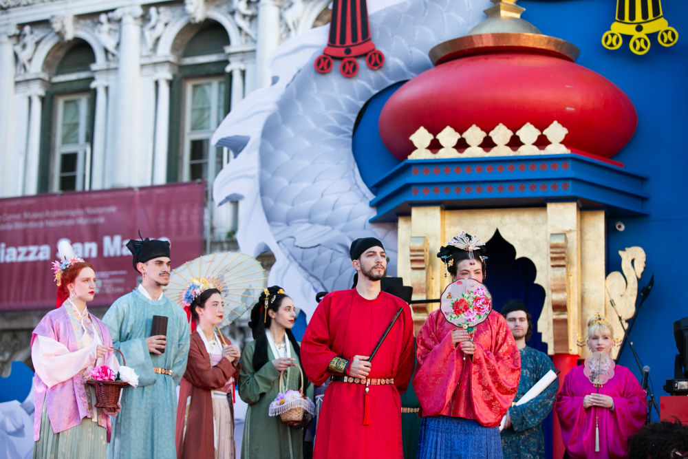 2024年2月13日,在意大利威尼斯,志愿者身着汉服进行表演。新华社记者 李京 摄
