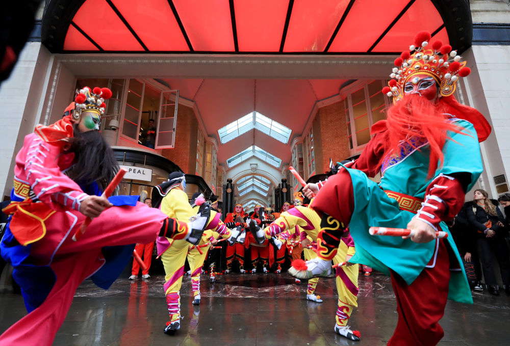 2024年2月10日,来自广东普宁的英歌舞团演员在英国伦敦伯灵顿拱廊街表演英歌舞。新华社记者 李颖 摄