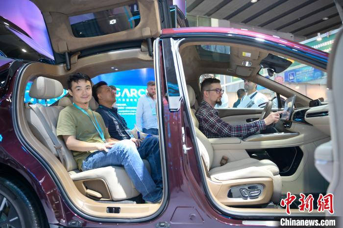 4月15日,第135届广交会在广州开幕,新能源汽车展区吸引采购商参观咨询。图为采购商体验一款中国企业制造的新能源汽车。中新社记者 陈骥旻 摄
