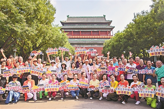 7月27日下午,众多市民来到北京中轴线上的钟鼓楼广场参加北京中轴线申遗成功快闪庆祝活动。本报记者 王伟伟 摄