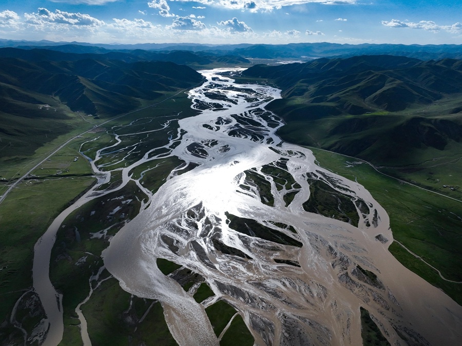 在青海省果洛藏族自治州达日县境内拍摄的黄河(2024年7月31日摄,无人机照片)。新华社记者 张龙 摄