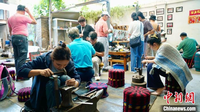 图为台青在大理鹤庆新华银匠村体验银器锻制技艺。海当 摄