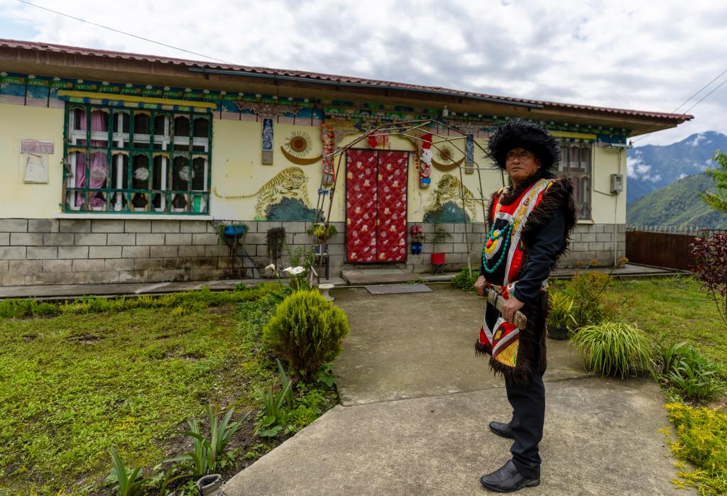 索朗在日常的衣服外披上传统珞巴服饰为记者做展示(4月25日摄)。新华社记者 姜帆 摄