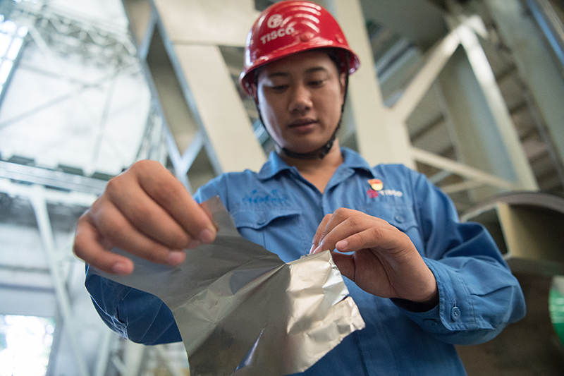 2018年8月8日,山西省太原市,太钢不锈钢精密带钢有限公司工作人员用手撕开不锈钢。