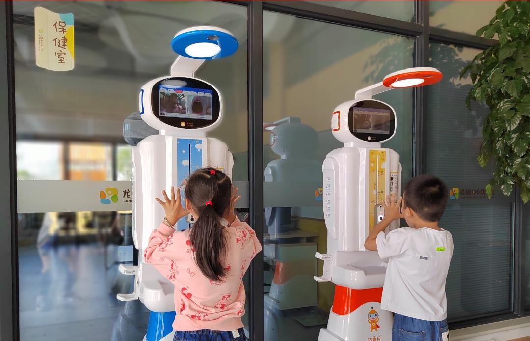清晨,在乌镇首个智慧化幼儿园——乌镇龙翔中心幼儿园,憨态可掬的晨检机器人代替老师与孩子们互动,并对他们进行健康测量。
