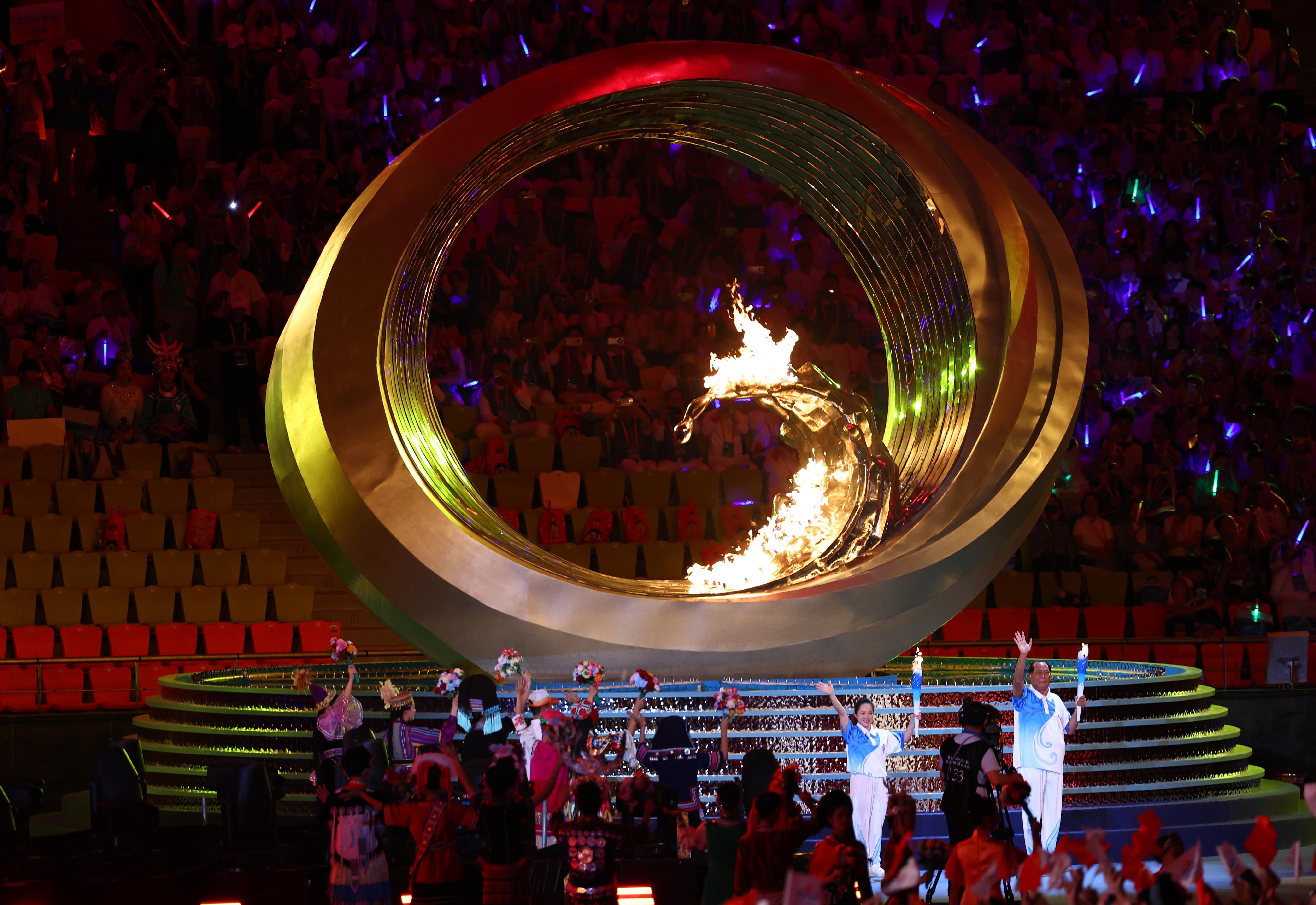 11月22日,主火炬在开幕式上被点燃。新华社记者 杨植森 摄 在12名火炬手的接力传递下,最终由王书茂和符攀婵共同点燃主火炬,水与火在这座热情的海岛城市交相辉映。 亮点四:科技赋能 在全场观众“哇”的一声惊叹中,整座体育场化身星辰大海。骑自行车、滑轮滑、脚踩平衡车的演员们手举海龟、鲨鱼、海豚等形象鱼贯而入,让观众如置海底。随后,高铁飞驰、深海探测、火箭发射、太空行走等画面在星海中逐一呈现,展现了我国在高科技领域的发展成就,带来生动的沉浸式体验。