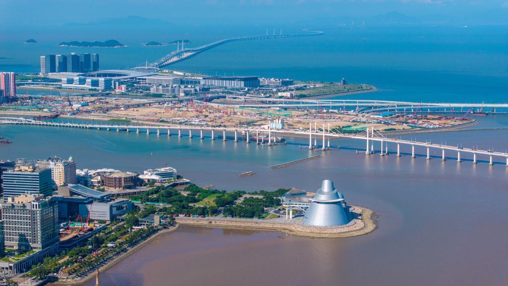 2024年8月3日拍摄的澳门科学馆(前)、澳门新城A区和港珠澳大桥(后)(无人机照片)。