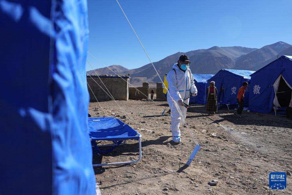 1月8日,在日喀则市定日县措果乡雪珠村安置点,救援人员帮助受灾群众搭建帐篷。新华社记者 沈伯韩 摄