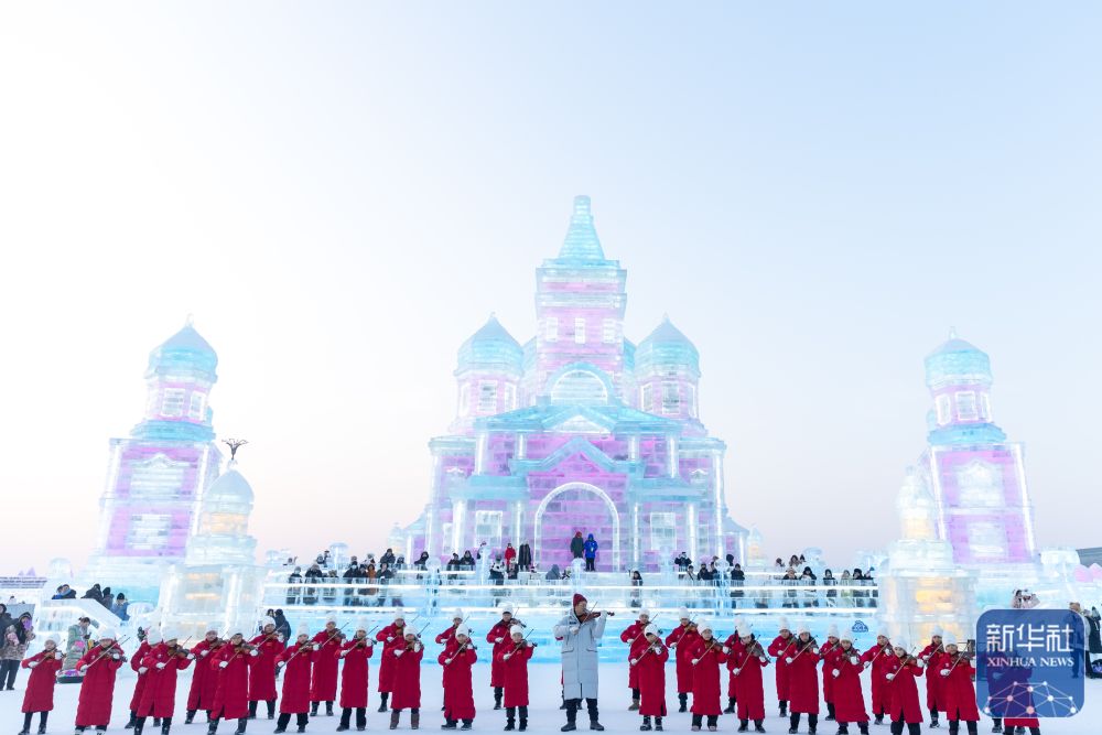 当日,哈尔滨冰雪大世界园区上演音乐“快闪”,为即将到来的亚冬会助力。