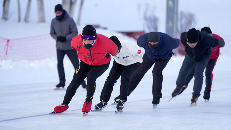 来自黑龙江省鹤岗市冬季运动项目训练中心的李海霞教练,正带着小队员们训练。作为一名援疆干部,同时也是速度滑冰教练员,她将自己的训练理念带到新疆。