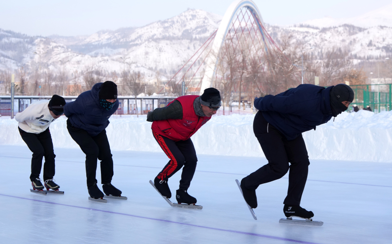 不一会儿,一群孩子涌入冰场,他们是阿勒泰市业余体校的小运动员,年龄8到15岁不等。他们脱下厚重的棉衣,换上连身服,开始在冰面上滑行,在教练的指挥下,时而冲刺,时而慢行调整,轻快的脚步让“老朋友们”赞叹,“这些小孩厉害啊,比我们那会儿强多了”。
