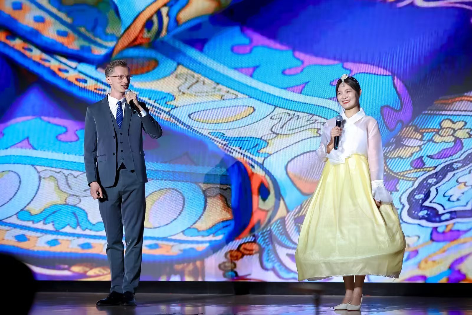 2024年11月,第26届齐越朗诵艺术节暨全国大学生朗诵大会在中国传媒大学举行。金花利和北京语言大学俄罗斯留学生张威雨朗诵的诗歌《我爱你,中国》饱含深情,赢得了观众的热烈掌声,获得“优秀艺术表现奖”。 金花利:我第一次读《我爱你,中国》的时候,就深深地喜欢上了这首诗歌。在中国生活了一年半的时间,我已经变成一个非常非常爱中国的外国人,我的搭档也特别爱中国。我们在读这首诗歌的时候根本就不需要去表演,全部都是内心感情的抒发。参加这次活动之后,我们两个更爱中国了。