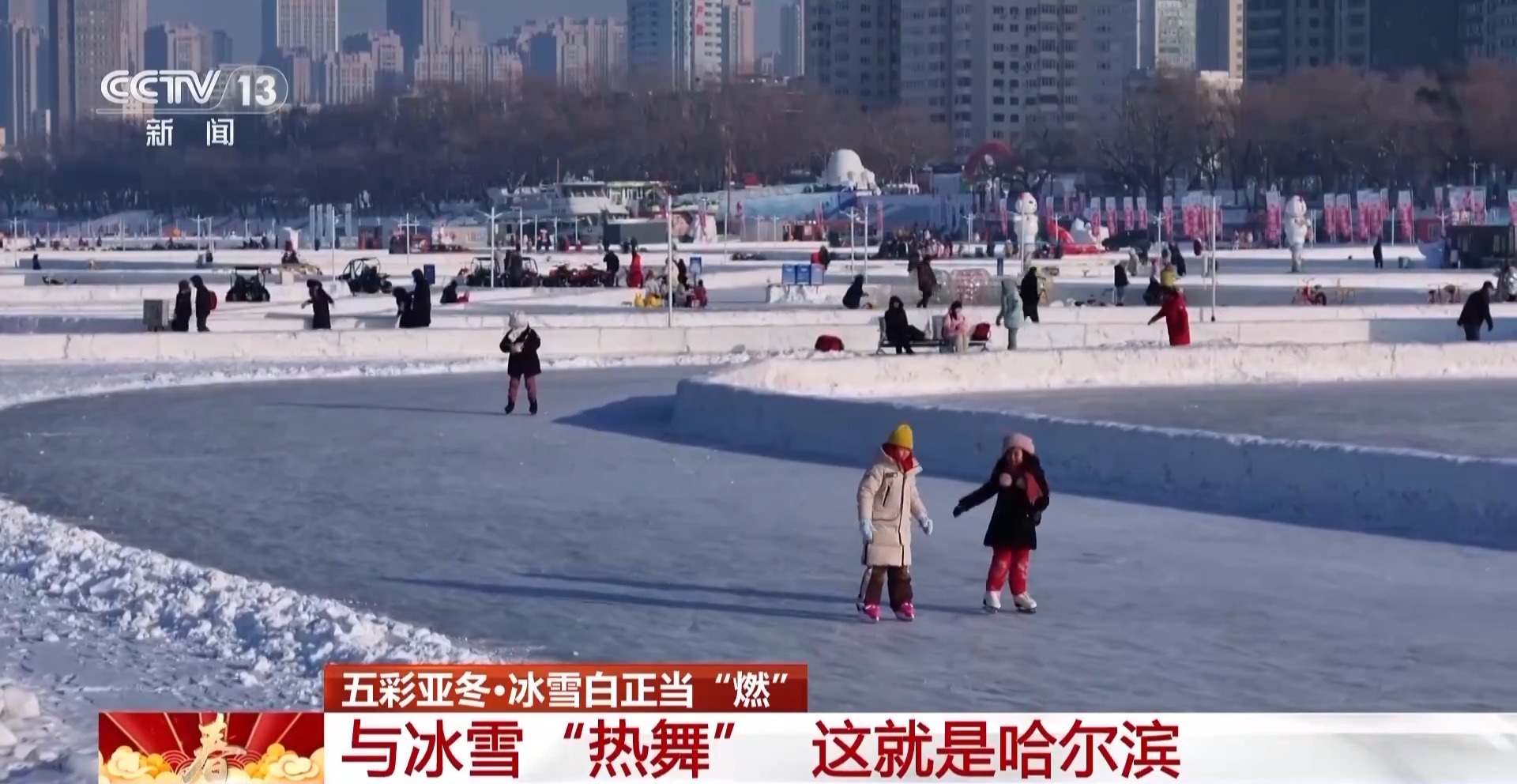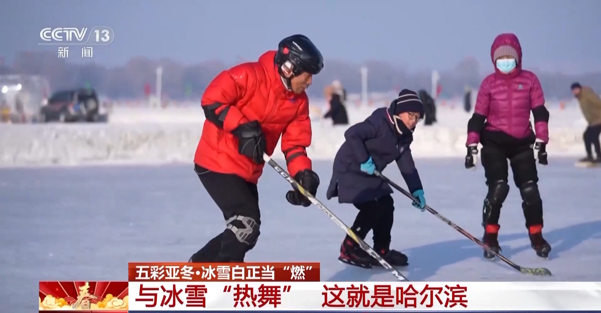 在松花江上的公益冰场,我们看到男女老少玩得这叫一个热“雪”沸腾,打冰球、玩冰车、溜野冰,不亦乐乎,而这些对于哈尔滨人来说,不过是冬日里再平常不过的日常。李乃凡大姨和8岁的小孙女你追我赶,在冰面上刮起了一阵阵旋风。