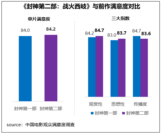 《封神第二部:战火西岐》为《封神三部曲》承上启下之作,影片以“西岐保卫战”为核心,利用先进的特效技术展现鲜活宏大的仙神斗法、金戈铁马和异兽奇观场景,成为对中国古老神话现代性转化的示范之作。影片保持高水平创作,观众满意度84.2分,略高于第一部0.2分;其中观赏性、思想性得分均略高于上一部,仅传播度相对略低。