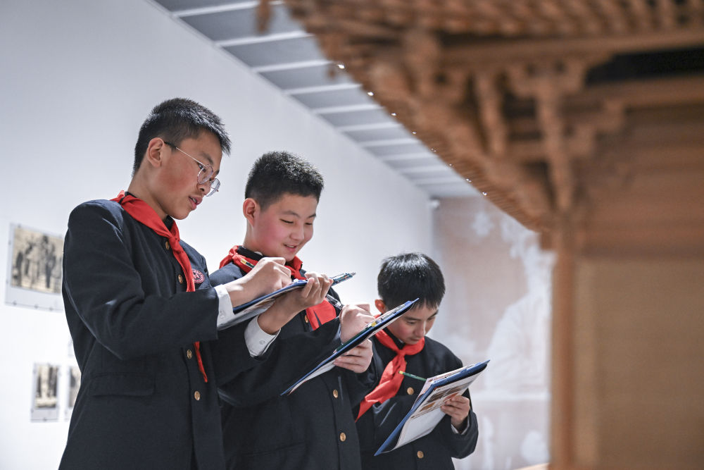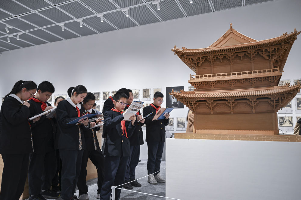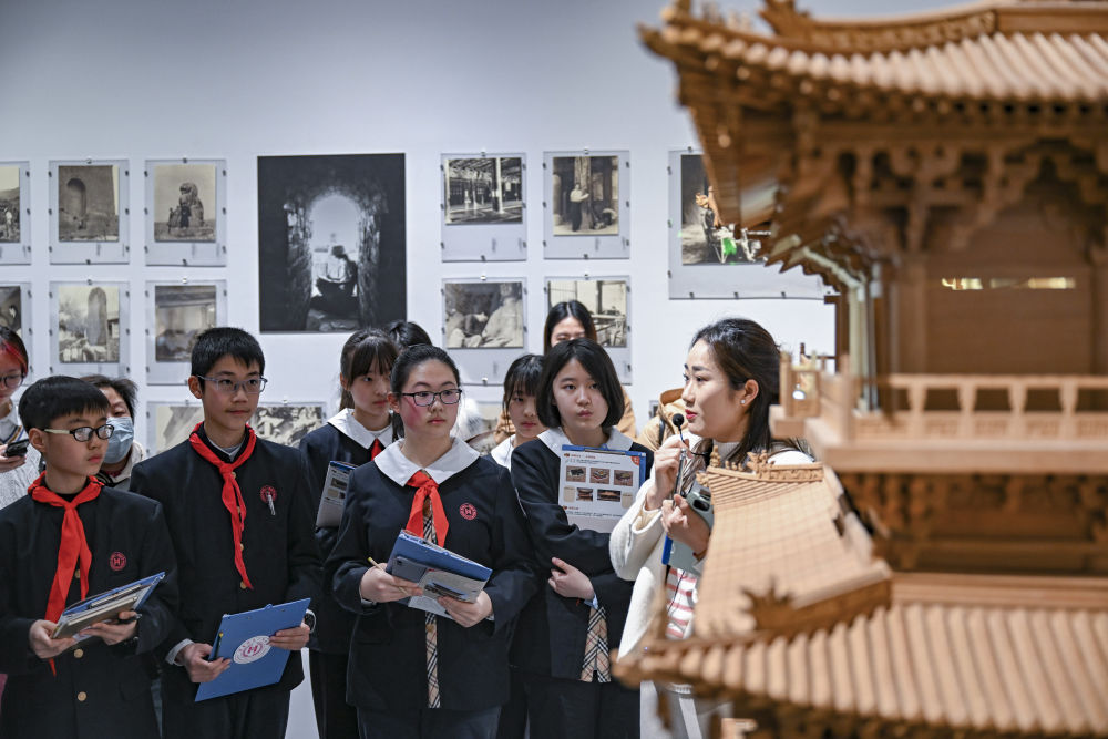 2月17日,华东师范大学第一附属初级中学的学生来到上海趣看美术馆,开启他们的“开学第一课”。学生们带着学习任务单走进“栋梁——梁思成与林徽因学术文献展”,探寻中国古建筑之美。