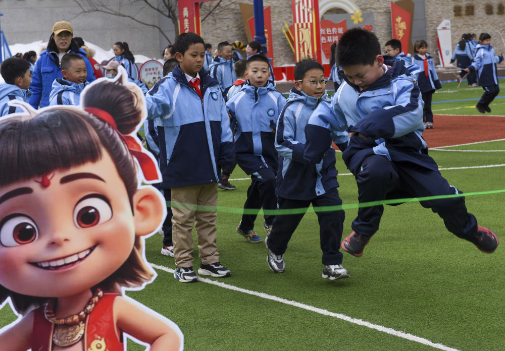 2月17日,学生们在新疆乌鲁木齐市第十三小学操场上跳绳。