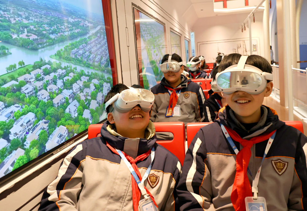 2月17日,在上海博物馆东馆,同济大学附属澄衷中学的学生佩戴VR眼镜观看传统节日视频。