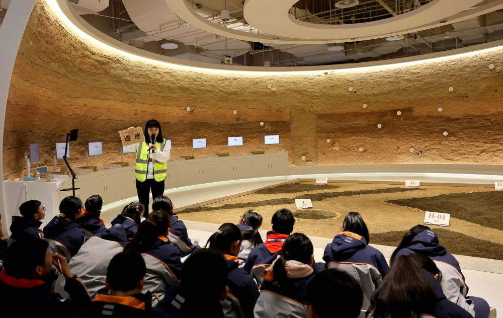 2月17日,在上海博物馆东馆,博物馆工作人员向同济大学附属澄衷中学的学生介绍田野考古知识。