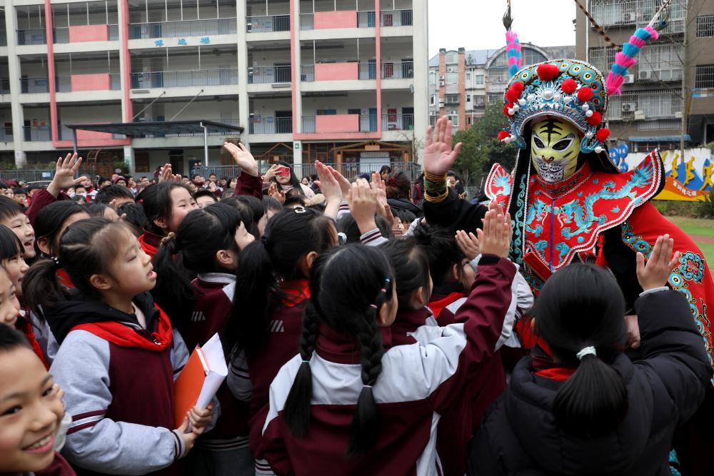 2月17日,在四川广安市广安区富源小学2025年春季开学典礼上,川剧演员为学生表演变脸。