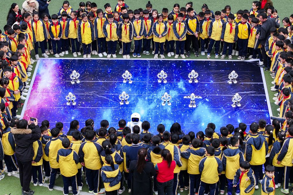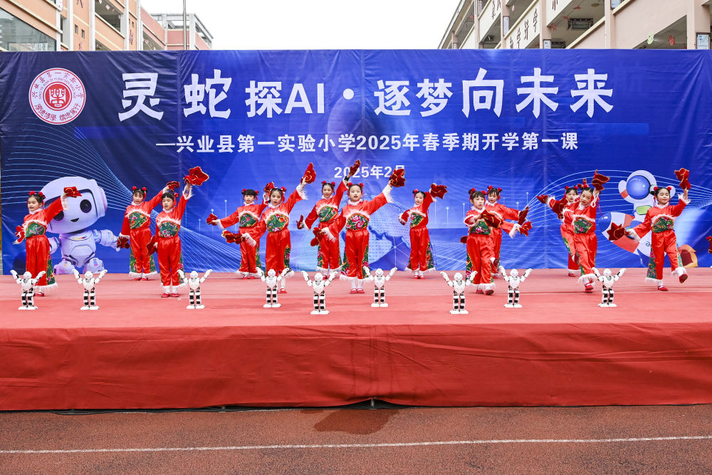 2月17日,在广西兴业县第一实验小学,学生们与机器人共舞。