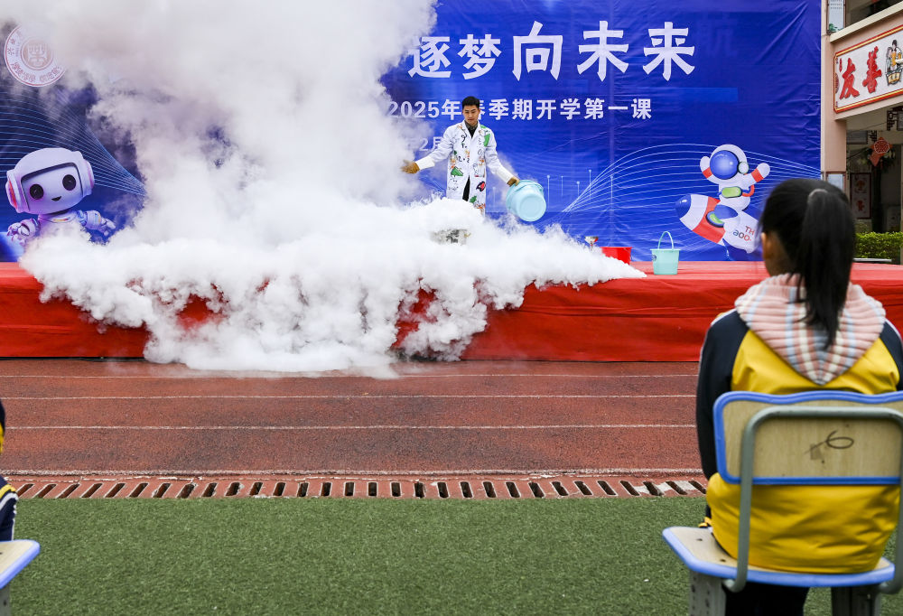 2月17日,在广西兴业县第一实验小学,老师在舞台上进行科学实验展示。