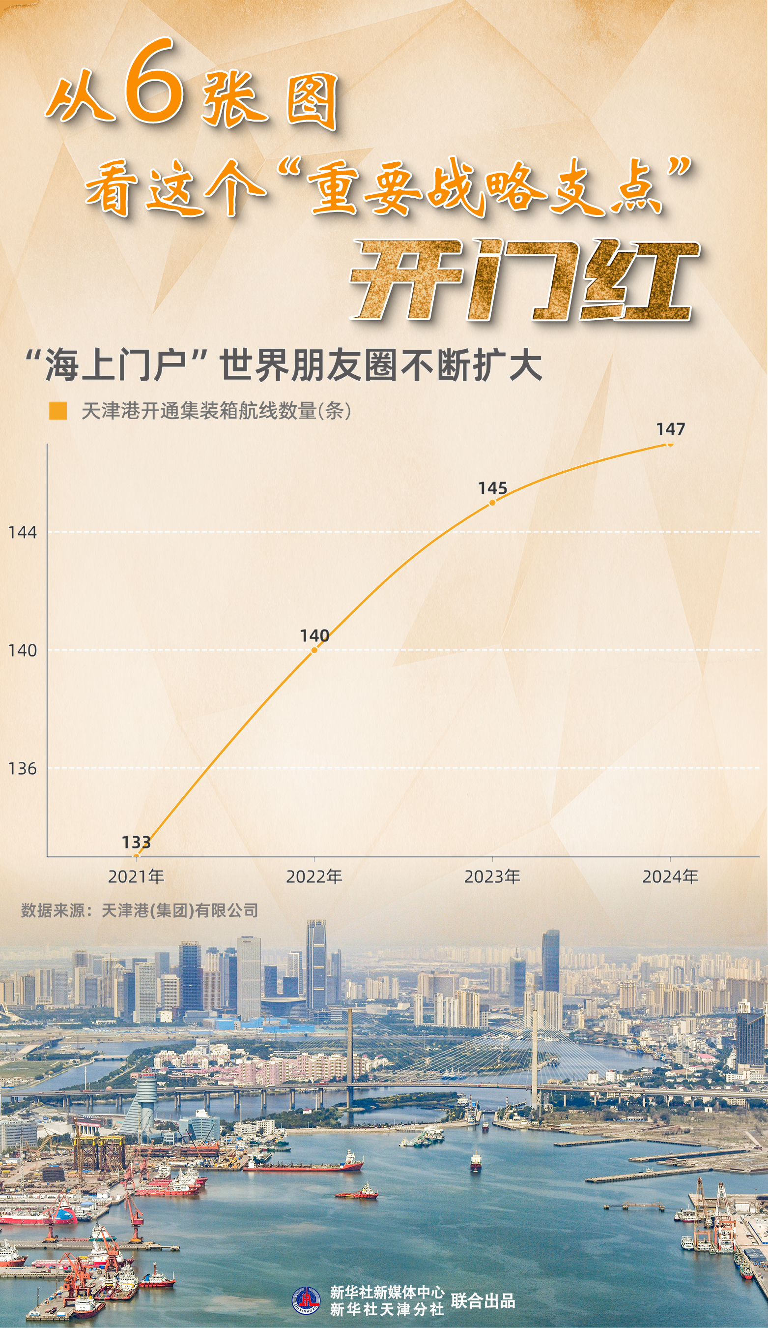 吞吐万汇、通达全球。天津港是我国北方地区联通国内国际双循环的重要战略支点,也是京津冀的海上门户,与全球180余个国家和地区的500多座港口保持联通,开通集装箱航线数量和集装箱吞吐量逐年攀升。(海报制作:方金洋)