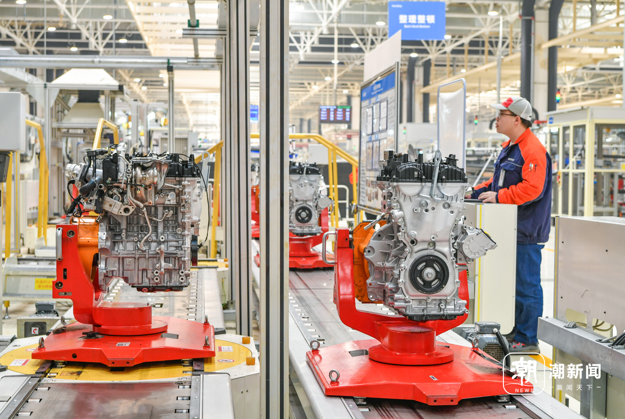 义乌吉利发动机工厂的生产车间内,技术工人在智能化装配流水线上赶制油电混动汽车发动机的生产订单。记者 金思成 通讯员 时宽兵 摄