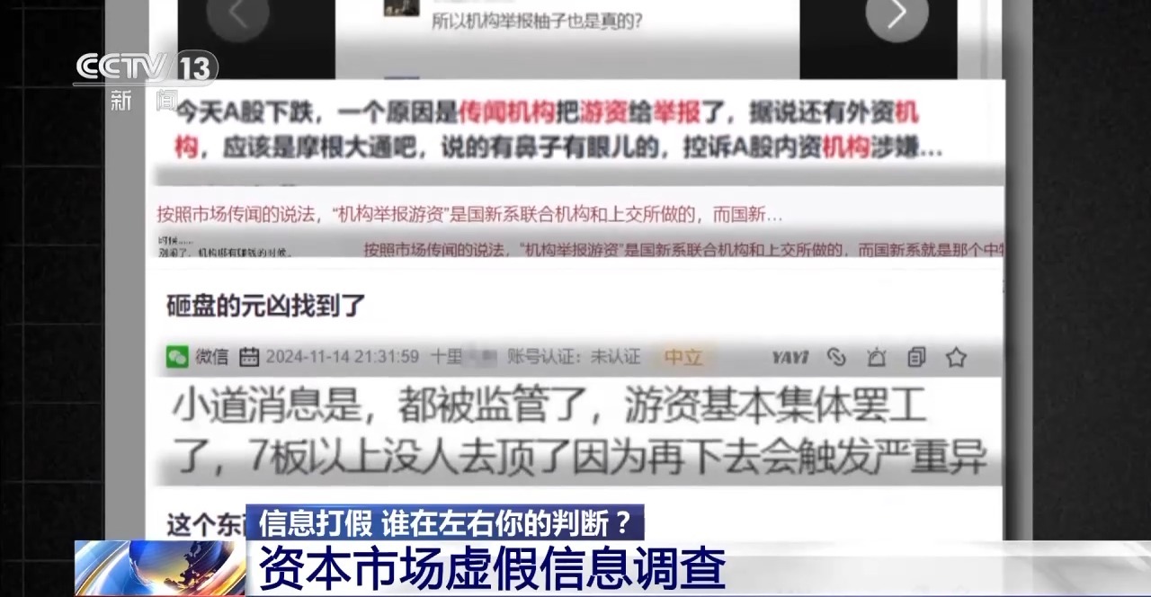 今天是3·15国际消费者权益日,守护消费者和投资者权益、维护市场公平一直是社会关注的焦点。 近年来,在资本市场,虚假信息如暗流涌动,不仅直接侵害了投资者的知情权,还可能冲击市场的稳定与秩序。这些虚假信息究竟从何而来?是谁在制造这些虚假信息?背后又暗藏着怎样的利益链条?为了揭开真相,总台央视记者兵分多路,深入调查,带您直击资本市场虚假信息背后的重重迷雾。 资本市场虚假信息调查 2024年11月14日午后,A股市场突然放量下跌。超大户、大户等游资集中抛售。在当天的网络上,这样一个话题迅速蔓延: “今天A股下跌,一个原因是传闻机构把游资举报了” “都被监管了,游资基本集体罢工了” “游资与机构干仗” 而这些消息都指向了同一件事:机构举报游资。
