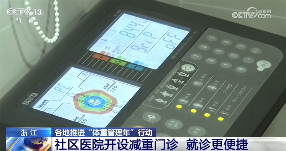 医生建议,对于有减重需求的人群,在饮食方面,需要限制含糖饮料、油炸食品等高热量食物的摄入,优先选择鱼类、豆类等优质蛋白。在运动方面,要兼顾如快走、游泳等有氧运动与深蹲、弹力带等力量训练,普通成年人每周运动时间需累计150分钟以上。需要注意的是,如果要使用药物来辅助减重,务必在医生的指导下选择安全方案,不能自行盲目使用减肥药品。 浙江:社区医院开设减重门诊 就诊更便捷 今年,我国将持续推进“体重管理年”行动。目前,各地不少医院都开设了体重管理、减重等多学科联合等门诊,帮助居民“一对一”定制减肥计划。 在浙江杭州天水武林街道的社区卫生服务中心,就诊者正站在人体成分分析仪上,握住手柄进行身体测试。不到半分钟,医生便可开具一张带有身体质量指数、内脏脂肪等级等数据的分析报告,并以此为依据为患者定制减肥方案。前来复诊的董卉说,半年前,她因生娃体重明显增长,经过诊疗后,她已成功减重了30斤。