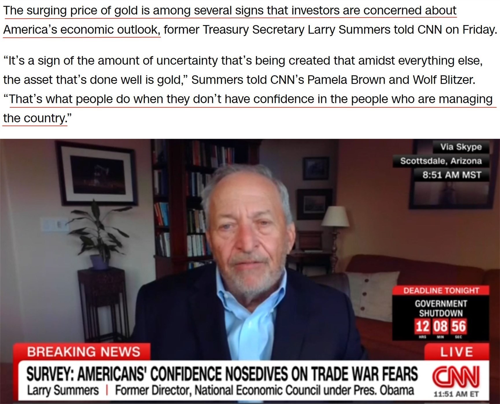 美国前财政部长劳伦斯·萨默斯在接受采访时表示,特朗普反复无常的政策和言行正在侵蚀全球市场对美元的信任,金价的大涨正是这种不确定性的体现。